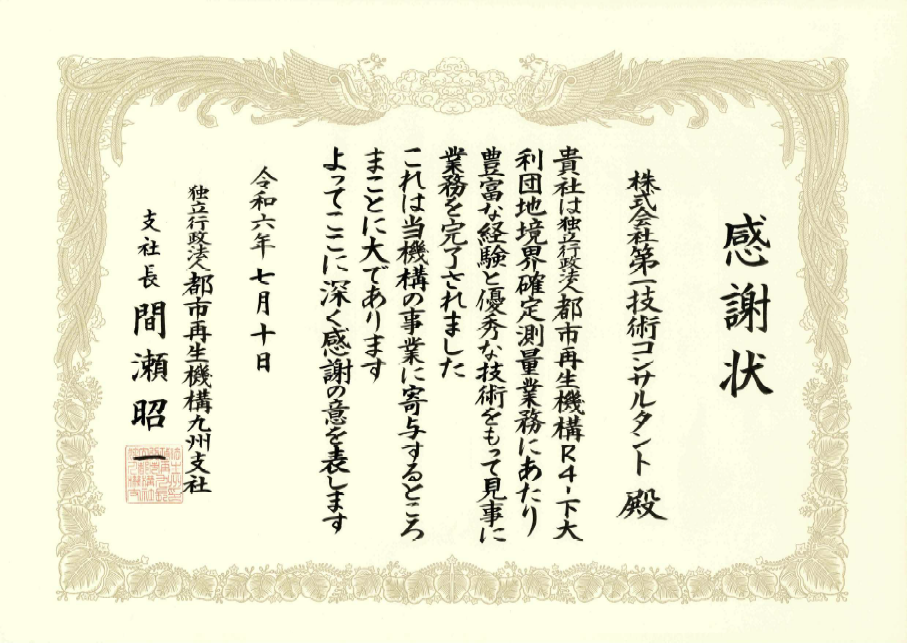 | 表彰 | ![]() 都市再生機構(UR)様からは、業務優秀により令和6年7月に 感謝状をいただきました。 |